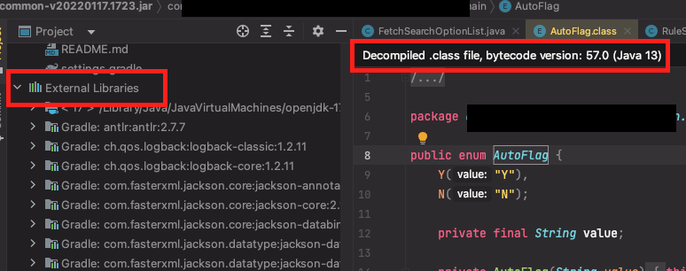 만약, 그 후에 특정 프로젝트에서 라이브러리를 사용할 때 아래와 같이 바이트 코드와 실제 코드가 서로 맞지 않다고 나타나면