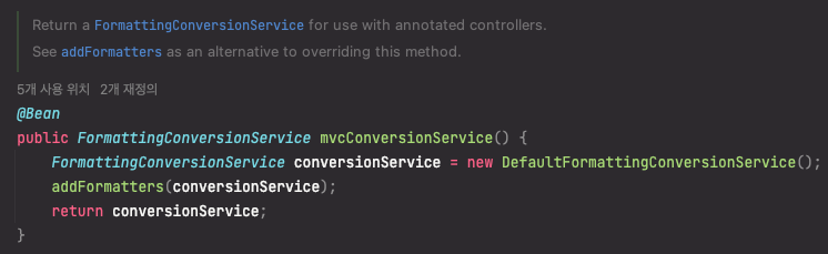 그리고 이 GenericConversionService 는 Spring Boot 로드 시에 WebMvcConfigurationSupport 에서 Bean 으로 등록되는데, 아래의 FormattingConversionService 는 GenericConversionService 을 상속한 클래스이다. 따라서 해당 Bean 을 가져오면 Spring MVC 에 등록한 Converter 를 사용할 수 있다.