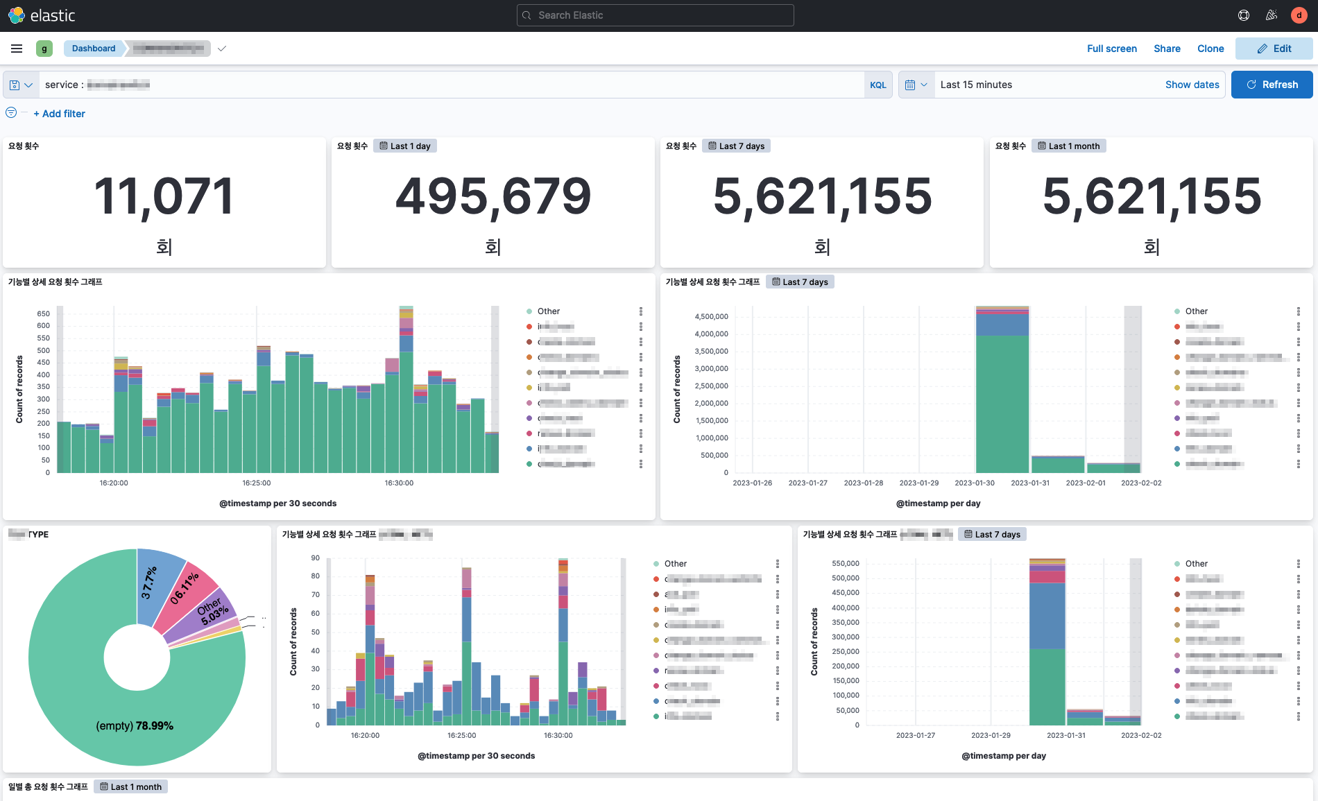 이렇게 함으로써 데이터가 적재되었고 대시보드를 아래처럼 만들게 되었다. Graylog 보다 훨씬 자유롭게 구성할 수 있었다.
