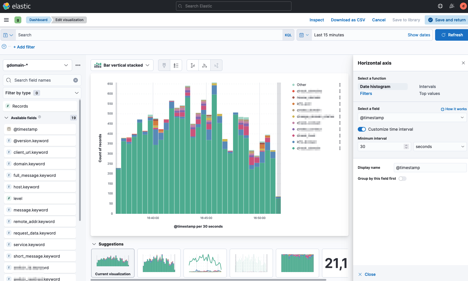 그래프를 표현할 때 아래의 'Customize time interval' 설정을 통해 간격을 자유롭게 설정할 수도 있다. Graylog 를 사용할 때 내가 정말 원했던 기능이었는데 쉽게 사용할 수 있었다.