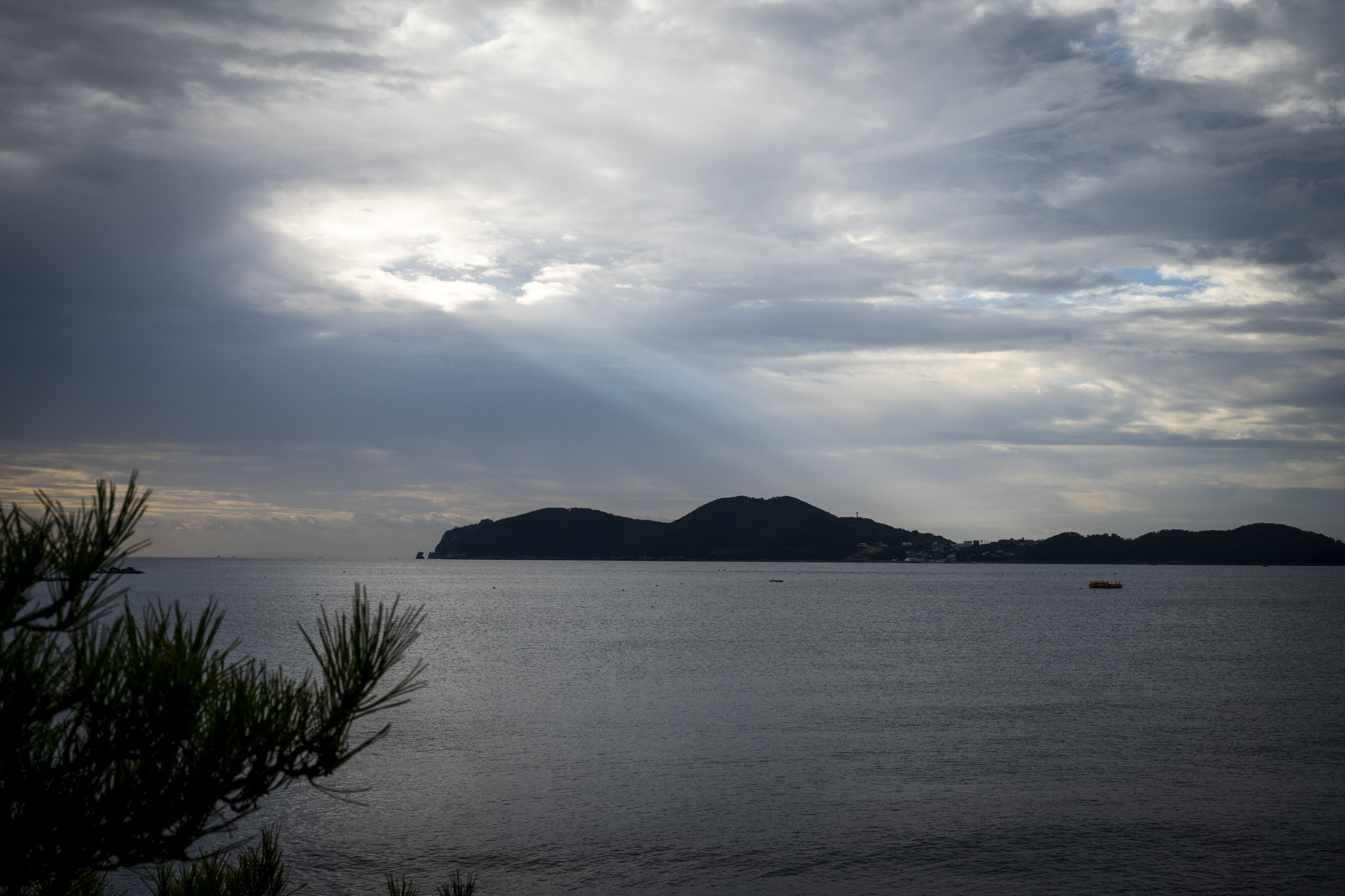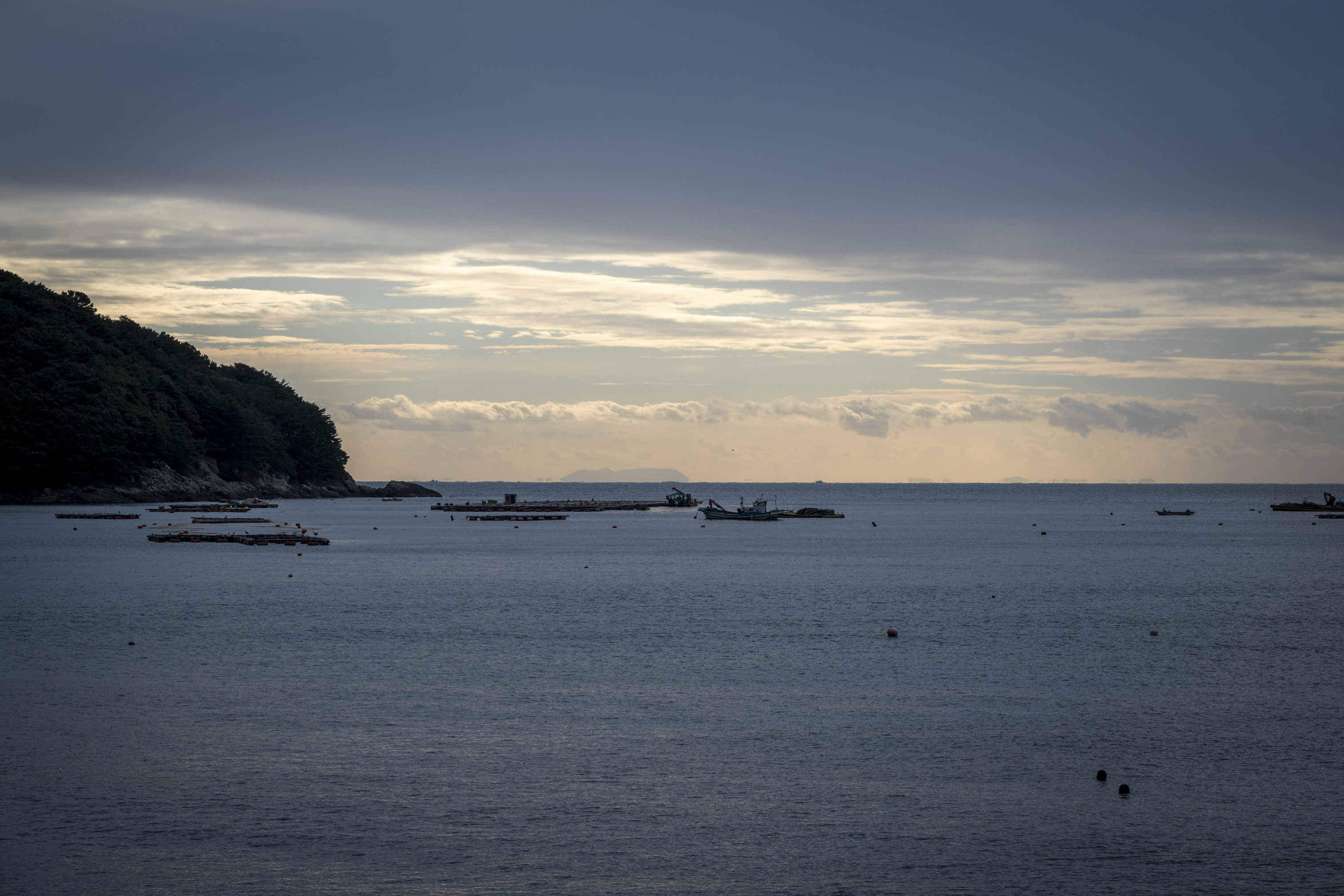 저 멀리에 배가 아침부터 이동하고 있었다.