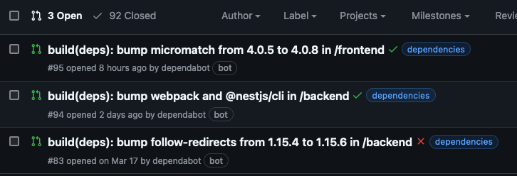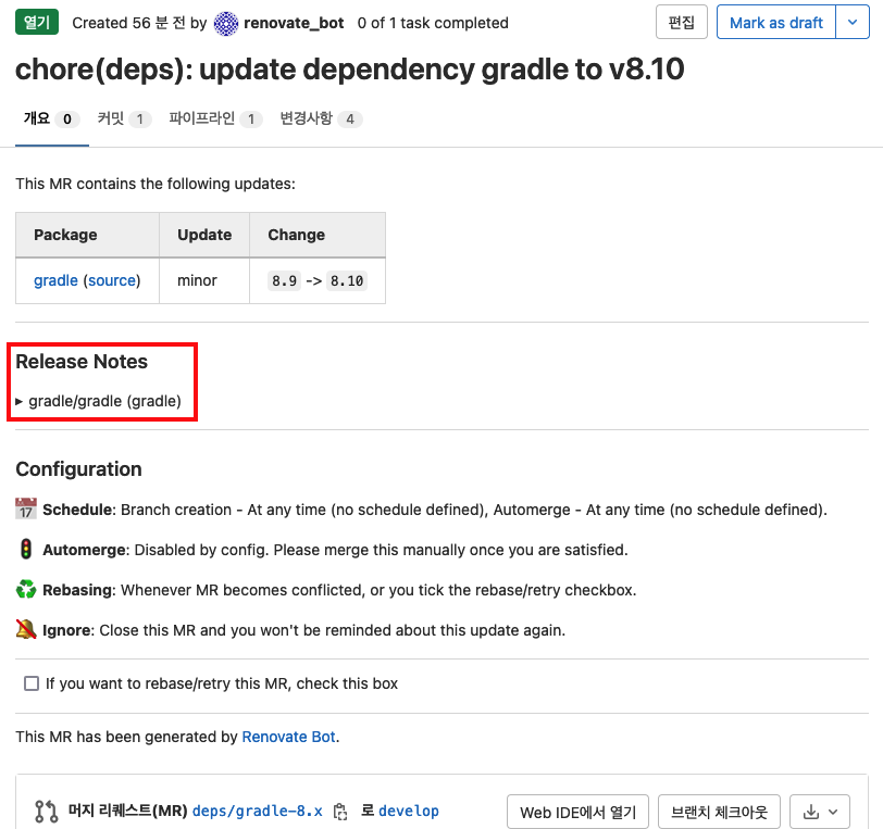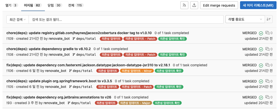 - 만약, 아직 병합하지 않은 MR이 있고 이 상태로 의존성 관리 매니저에서 해당 라이브러리 버전이 삭제된다면 해당 MR도 나중에 자동으로 close 처리된다.