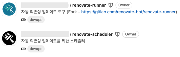 미러링 저장소는 renovate-runner 라고 이름을 지었고, 스케줄러 저장소는 renovate-scheduler 라고 이름을 지었다.