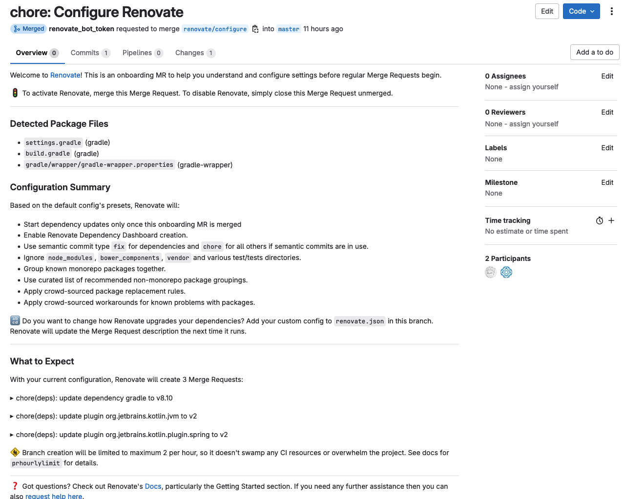 위의 MR을 통해 병합한 후 해당 저장소의 기본 브랜치에 renovate.json 파일이 있다면 저장소 내의 파일을 분석하여 의존성 업데이트 MR을 자동으로 올리게 된다.
