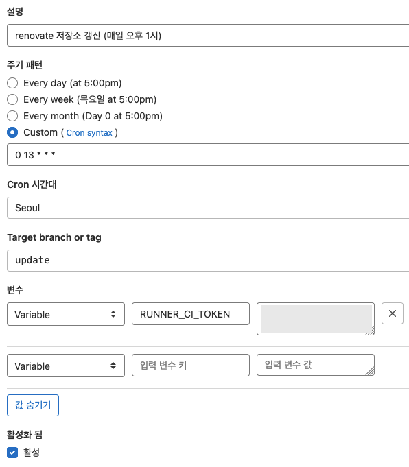미러링 저장소(renovate-runner)를 갱신할 일정은 아래처럼 구성한다.