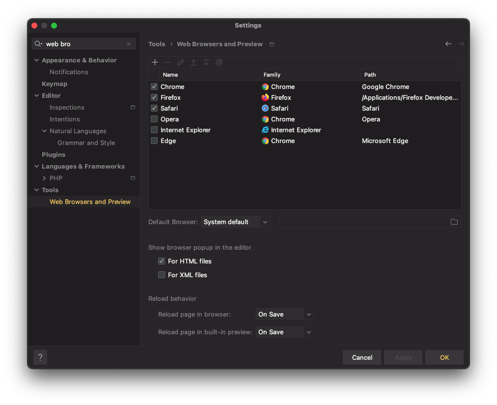 이럴 경우, Settings 창을 연 다음 좌측 메뉴에서 Tools > Web Browsers and Preview 로 들어가면 브라우저별로 열 수 있는 목록이 나온다.