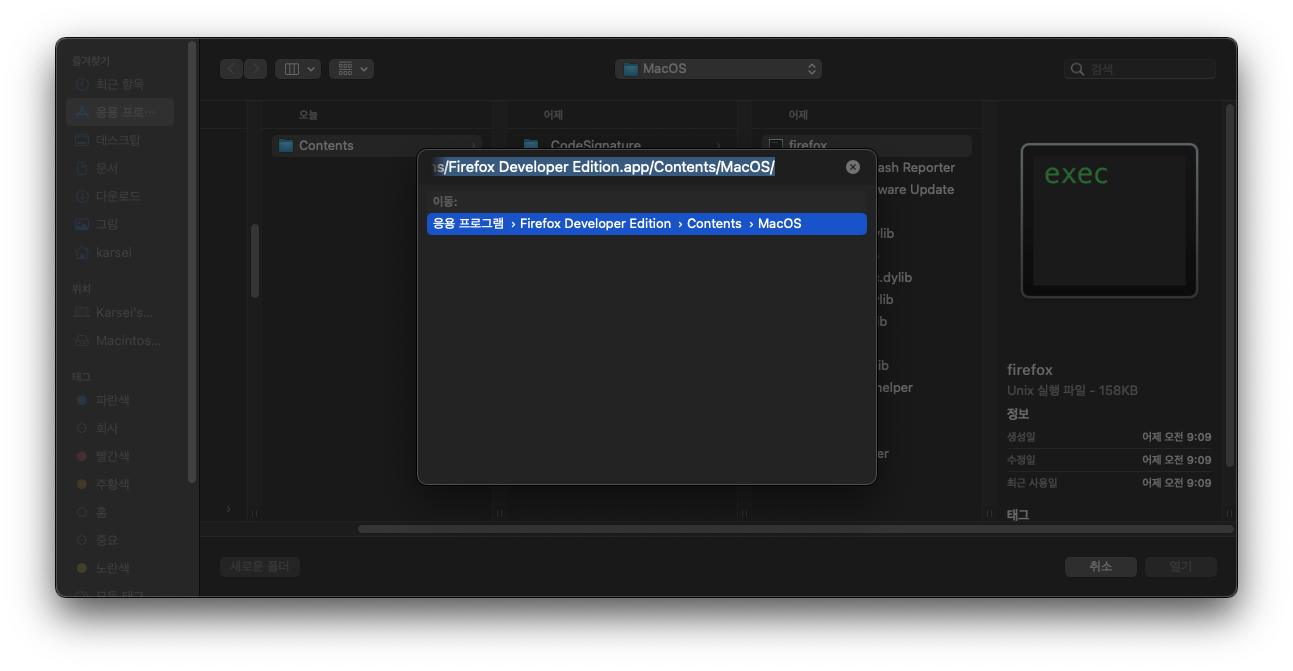 위 창에서 폴더 모양의 아이콘을 누르면 아래처럼 경로 창이 나타나는데 여기에서 Command + Shift + G 를 누르면 직접 경로를 입력해서 들어갈 수 있는 창이 작게 나타난다. 이곳에서 위의 경로로 들어가 firefox 를 선택해서 적용해주면 이용이 가능하다.