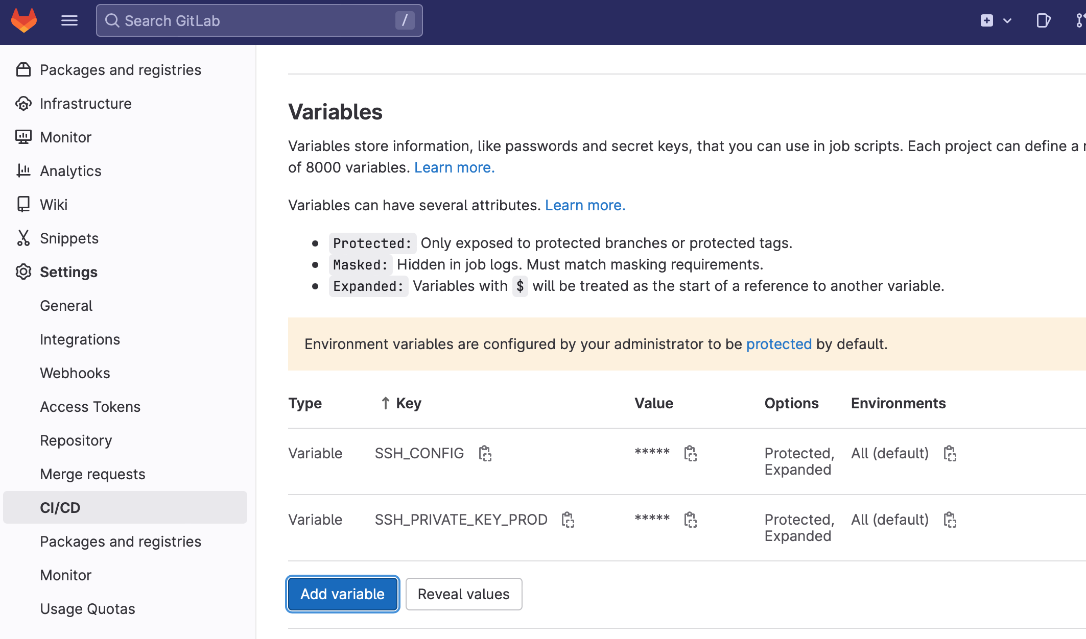 저장소나 그룹의 Setting > CI/CD > Variables 로 들어가면 등록할 수 있다.
