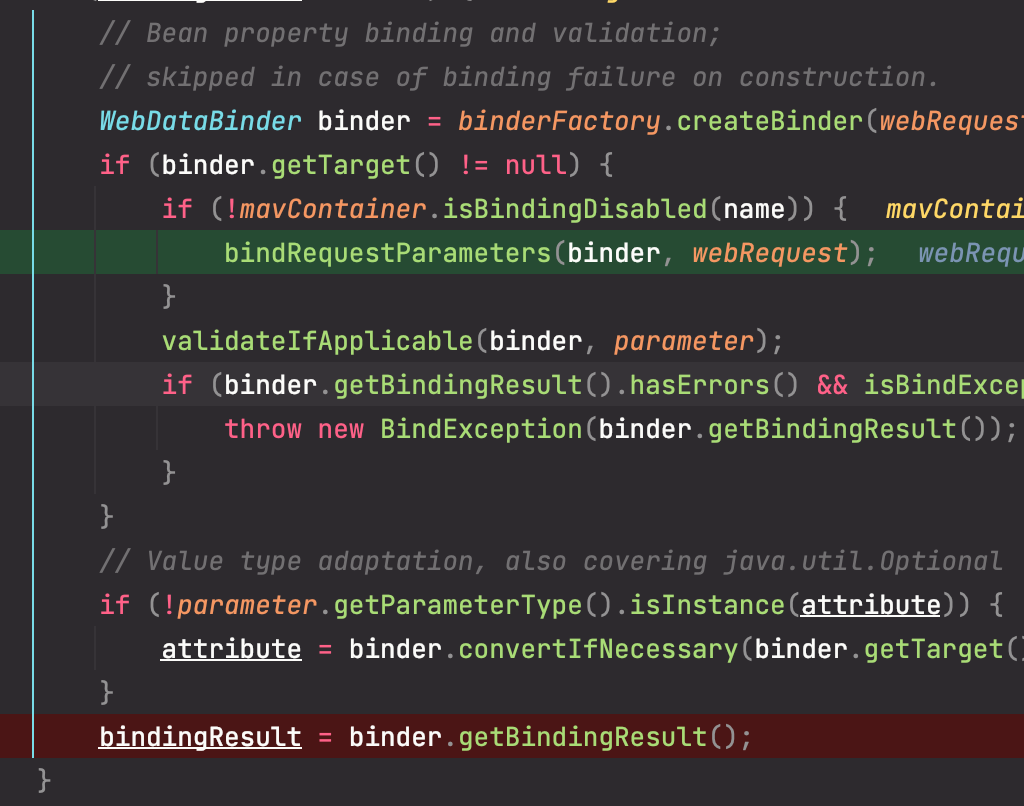 resolveArgument 메서드를 진행하면서 파라미터 바인딩을 시도한다.