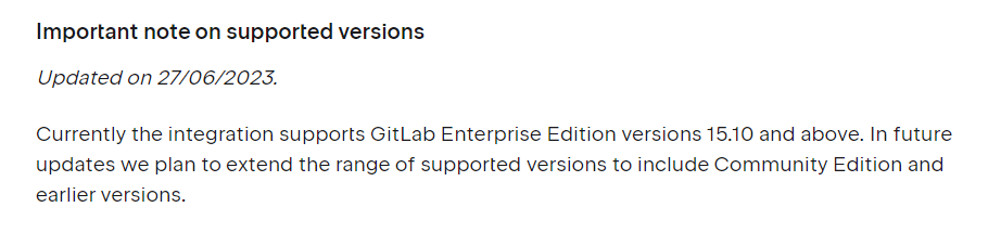 비록 현재는 GitLab 15.10 버전 이상만 지원한다고 하지만 향후 다른 버전들과 커뮤니티 에디션도 지원할 것이라고 한다.