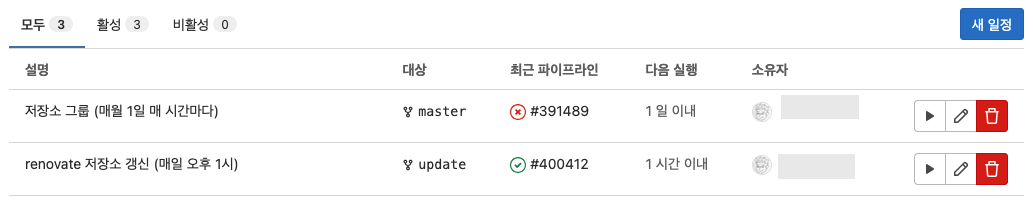 master 는 renovate 실행 용도이고, update 는 미러링 저장소의 업데이트 용도이다. GitLab CI 의 Scheduler 기능을 이용해서 브랜치에 따라 주기적으로 실행시킬 것이다.