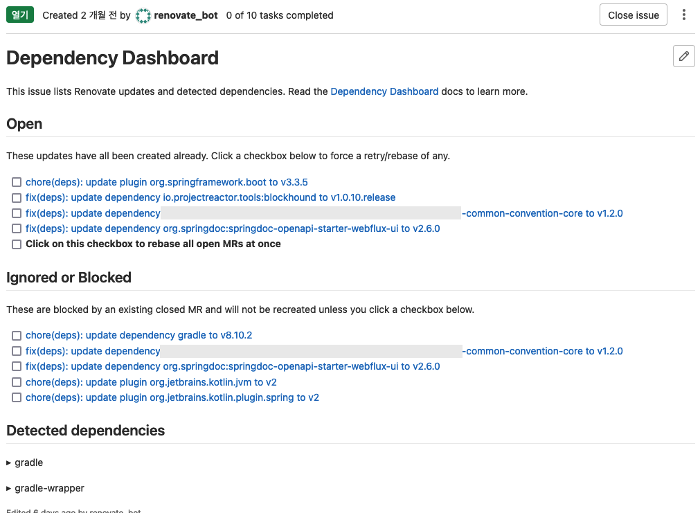 - 의존성 관리 매니저에 있는 라이브러리 버전에 따라 MR이 생성되고, GitLab 이슈에 의존성 대시보드가 생성되는데 이곳에서 의존성이 관리된다.