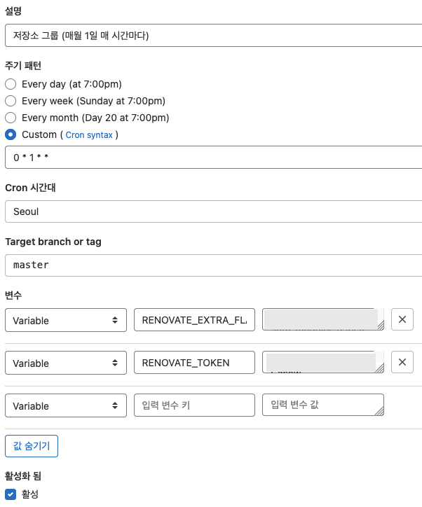 변수는 RENOVATE_TOKEN, RENOVATE_EXTRA_FLAG을 넣어줄 수 있다.