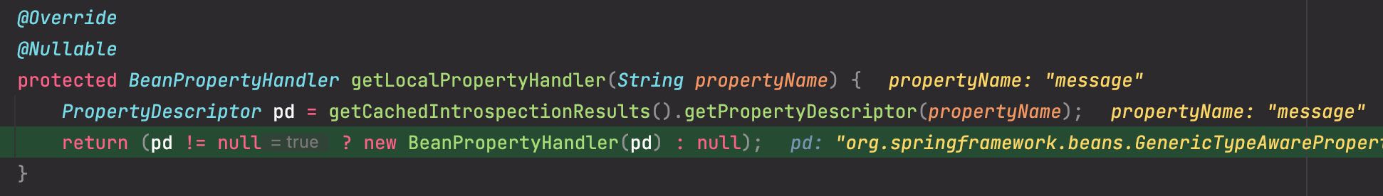 이어서 AbstractNestablePropertyAccessor 클래스의 processLocalProperty 메서드에서 사용자가 요청한 파라미터의 이름을 가지고 파라미터로 받을 클래스 내에 있는 Setter 를 사용하기 위해 멤버변수의 이름을 통해 PropertyHandler 를 찾는다.
