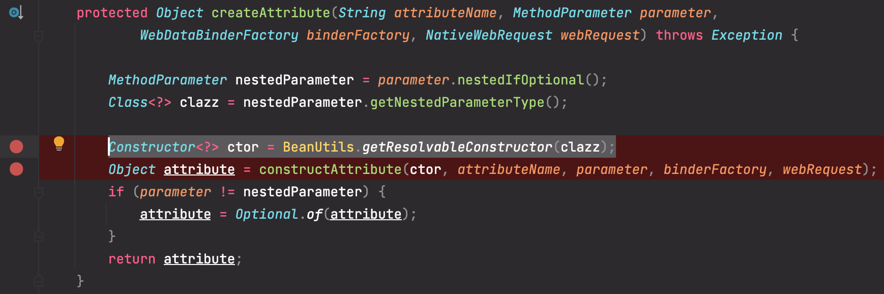먼저, createAttribute 내에서 클라이언트의 요청을 통해 데이터를 전달받을 클래스의 적절한 생성자를 찾게 된다.