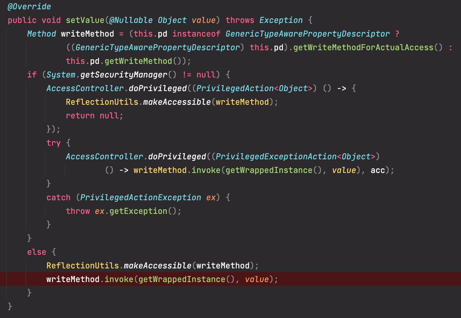 여기서 발견한 것이 없다면 해당 파라미터는 스킵하고, 있다면 BeanWrapperImpl 클래스의 setValue 메서드에서 해당 멤버 변수의 writeMethod 를 찾아 invoke 를 실행한다.
