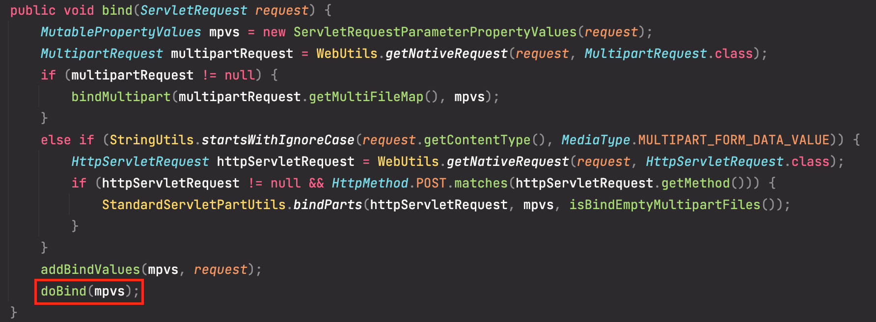 ServletRequestDataBinder 클래스의 bind 메서드를 실행하게 되는데 해당 메서드를 살펴보면 클라이언트의 요청을 어떤 유형으로 보냈느냐에 따라 데이터를 처리하는지 알 수 있다.