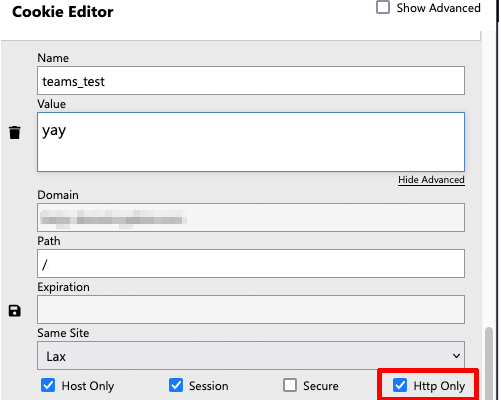 "teams_test" 라는 이름으로 httpOnly 와 secure 속성을 가진 쿠키를 사용했을 때와 안했을 때를 관찰하고, 그 차이점을 알아보는 것이 목적이다.